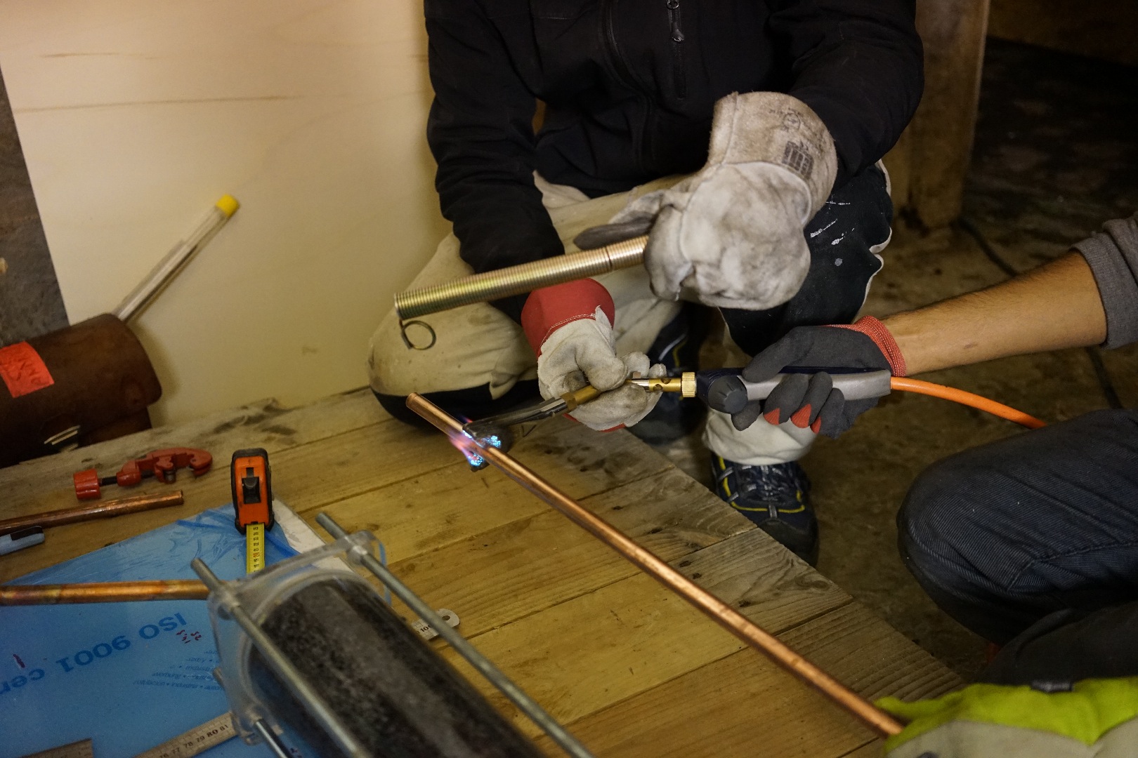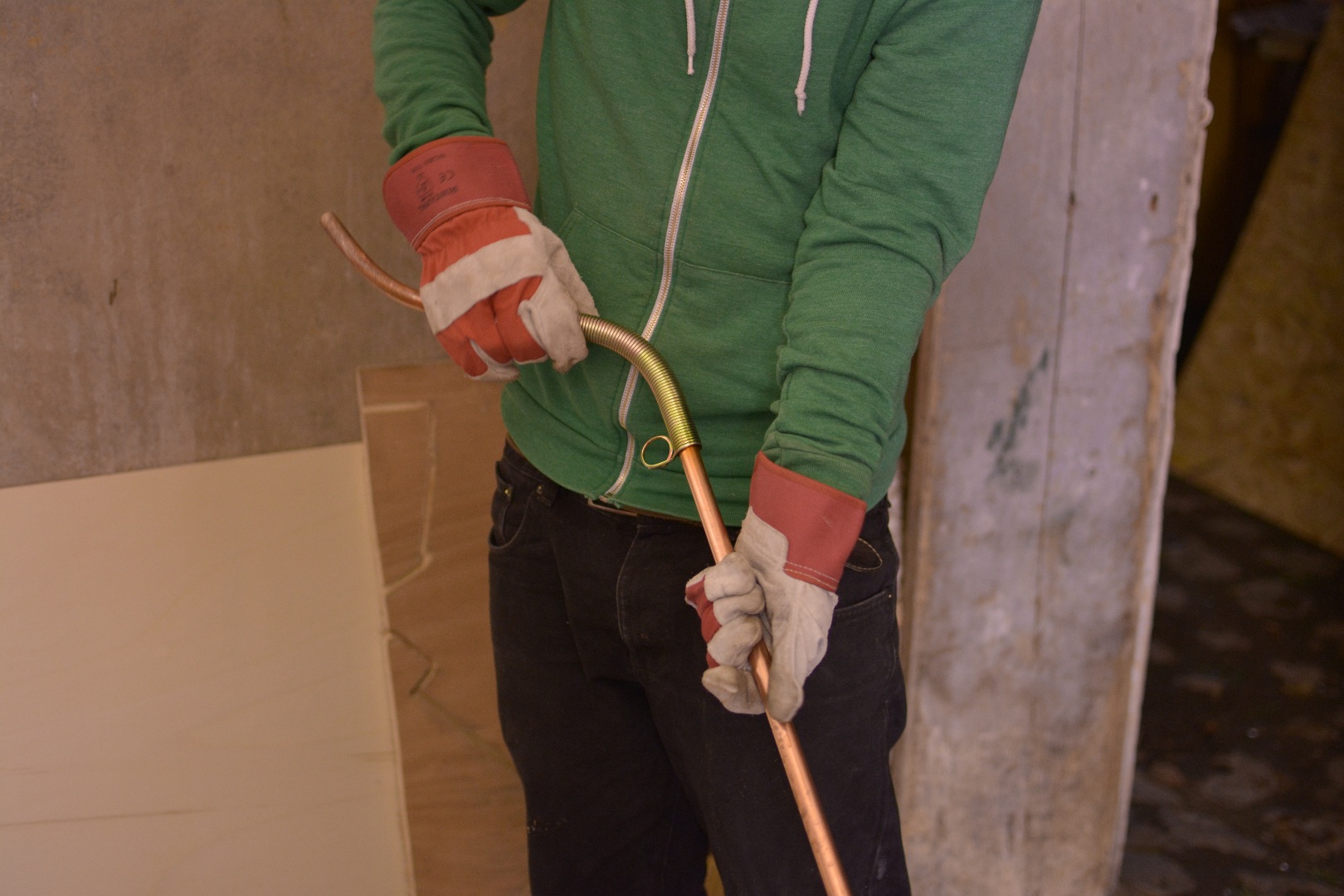 Basics - heat up your copper pipe with a blowtorch. Focus the flame on the areas above and below where you will do the bending so that part doesn’t get hotter and thus weaker than the rest of the steel. Once the copper turns blackish and starts making a cool psychedelic rainbow effect you know the copper is warm enough to begin bending. Turn off the flame and wait a moment. Once the pipe has cooled a little use the pipe bending tool so make an appropriate bend. This is more craft than technical skill and you just have to observe and see how the metal flexes. Don’t put too much pressure on one spot, this may result in a distorted pipe. You want to keep the diameter of the inner pipe as even as possible. Use a pipe bending tool.