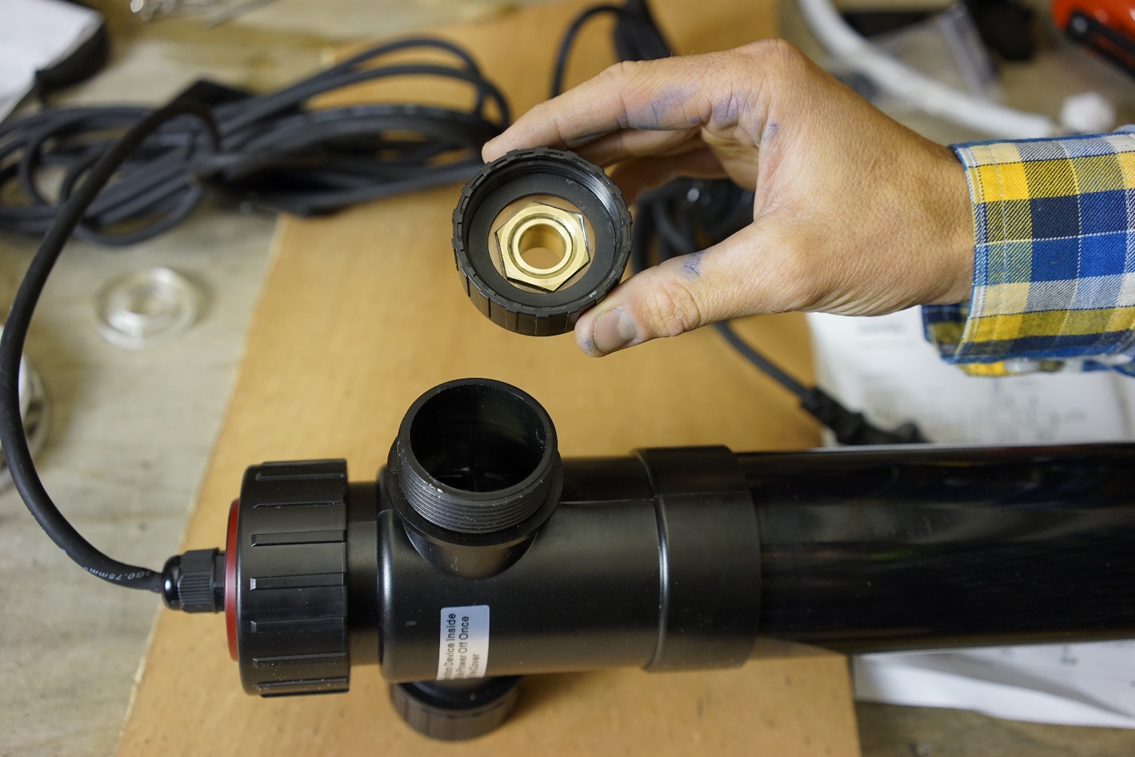 The cap is on the far right. A dip is etched into it to fit the hexnut/lock nut in the same way as in the filter lid. The Male-male brass union fastened to the UV cap is what allows the water tight connection between the UV lamp and piping. Special care should be taken with this UV cap because Acrylic will still let UV light through, while not included in the following picture sets the outer side of the cap should be coated in white paint (with titanium dioxide) or otherwise taped up so that you don't get exposed to the light directly.