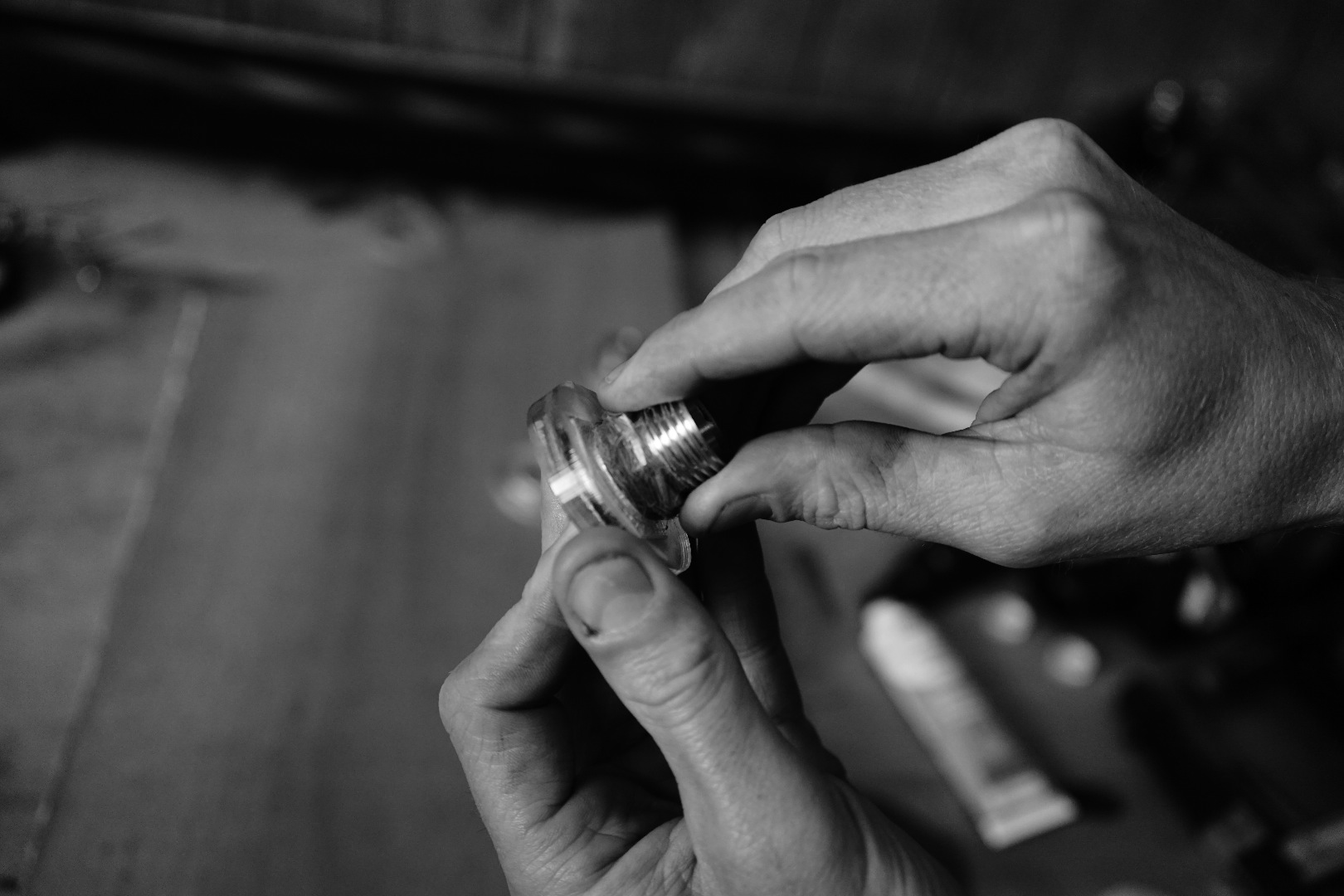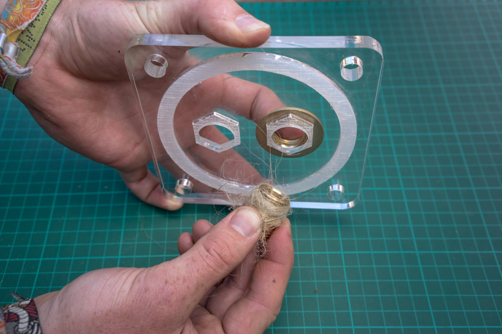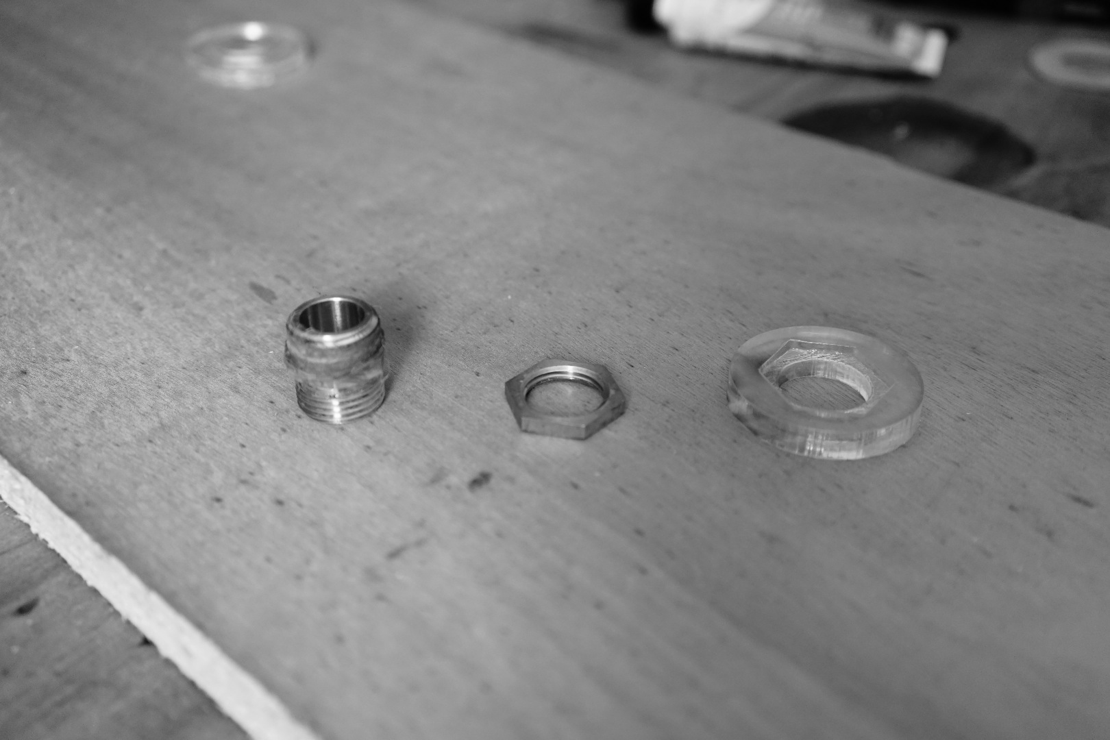 You should have laser cut the cap from the previous step. It can be seen in the picture on the right, next to the lock nut and brass union.