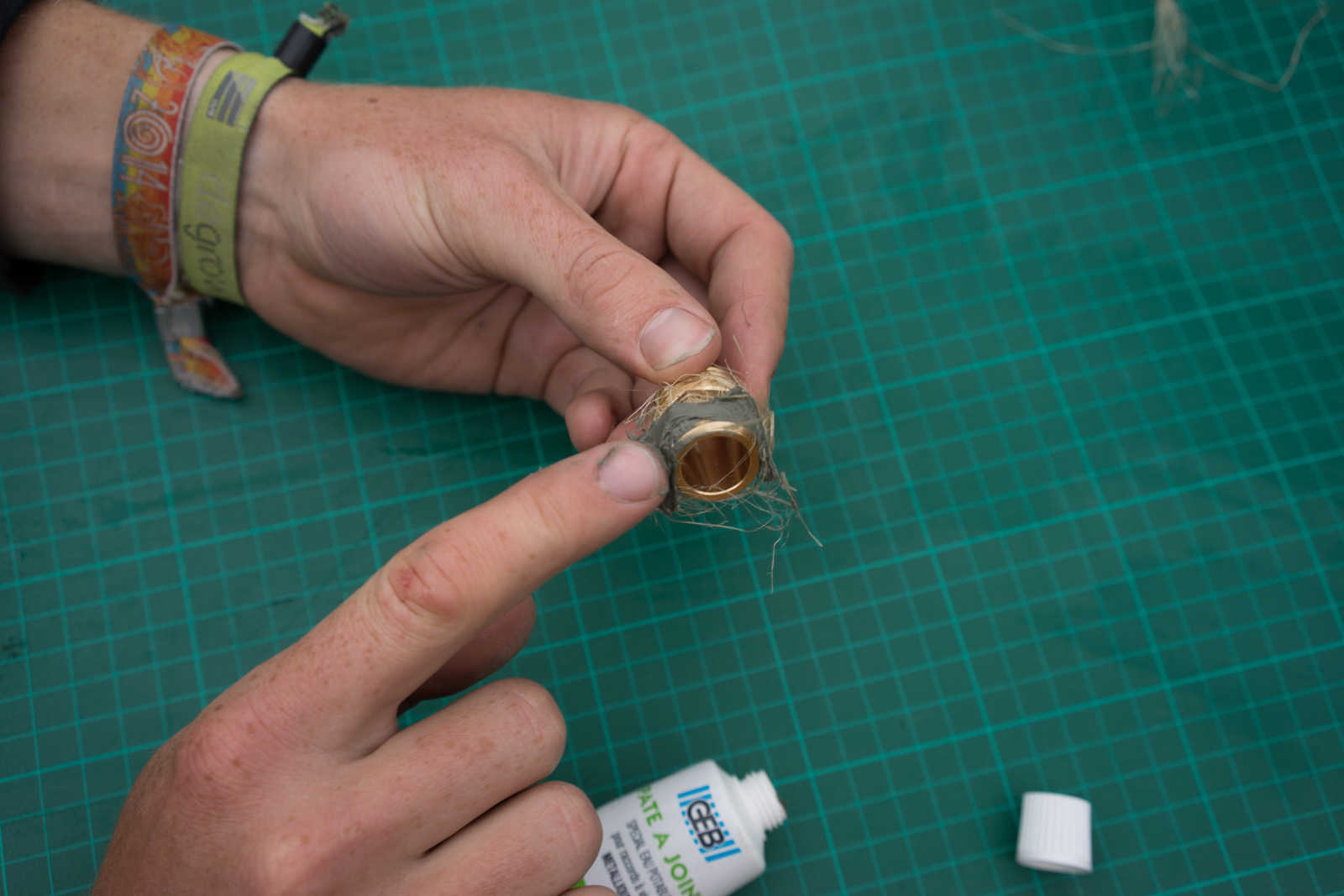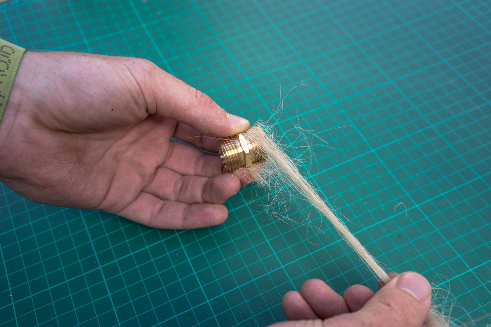 This part may take some practice figuring out just how much fibre to use. You can also replace the fibre with teflon tape (pipe tape) and as a rule of thumb I do about 8 layers (times around) but it depends on the size of the hole.