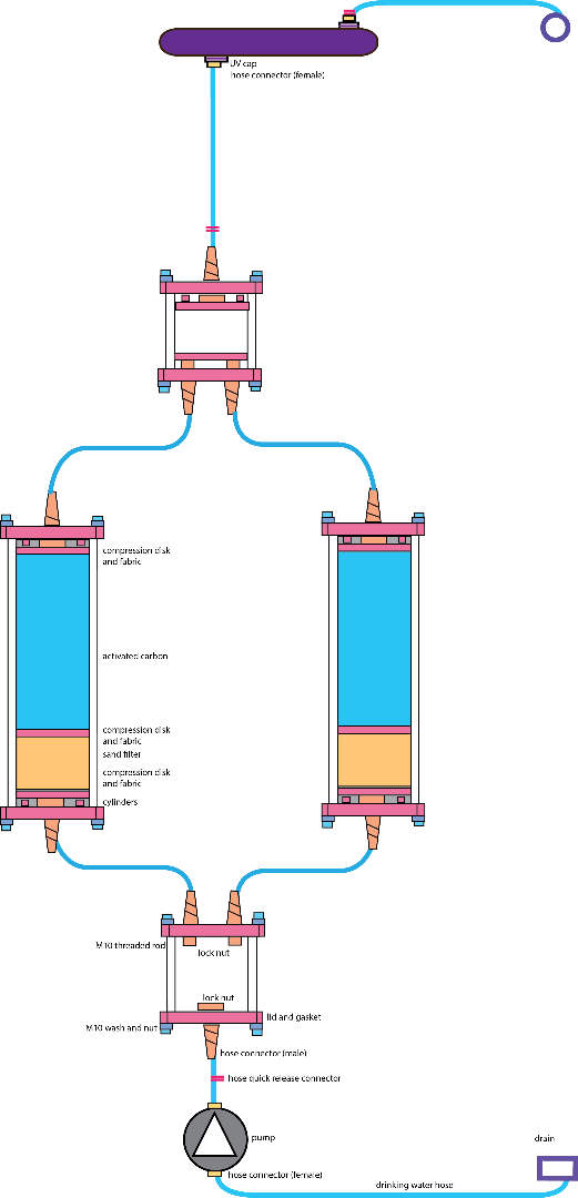 The filter housings should be 55 cm long and the flow regulator pipe should be around 10 cm long but shorter bits may work just as well and therefore require less water. The flow regulators can be left out of the build completely but there's something great about being able to see dirty water in the lower one get cleaned up by the filters and to get visual feedback in the top one which should be around eye height.