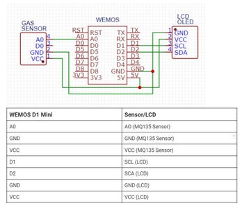 sensor MQ-35 gas untuk memantau kualitas udara. Sensor ini mendeteksi berbagai gas seperti karbon monoksida (CO), amonia (NH3), metana (CH4), dan banyak lainnya. Data yang diperoleh dari sensor gas ini kemudian ditampilkan pada layar OLED mini 0,96 inci.