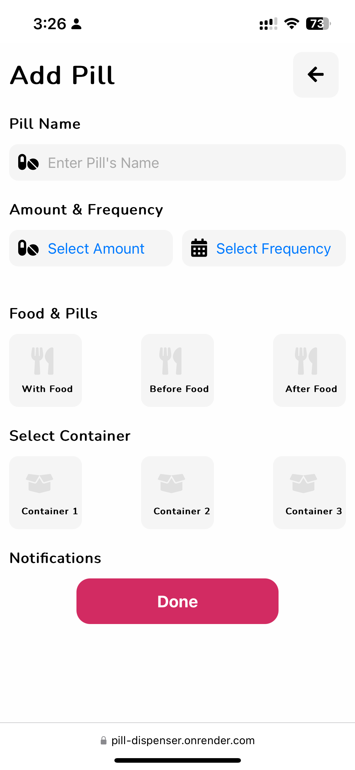 - Allows users to create and manage pill schedules with the following inputs: