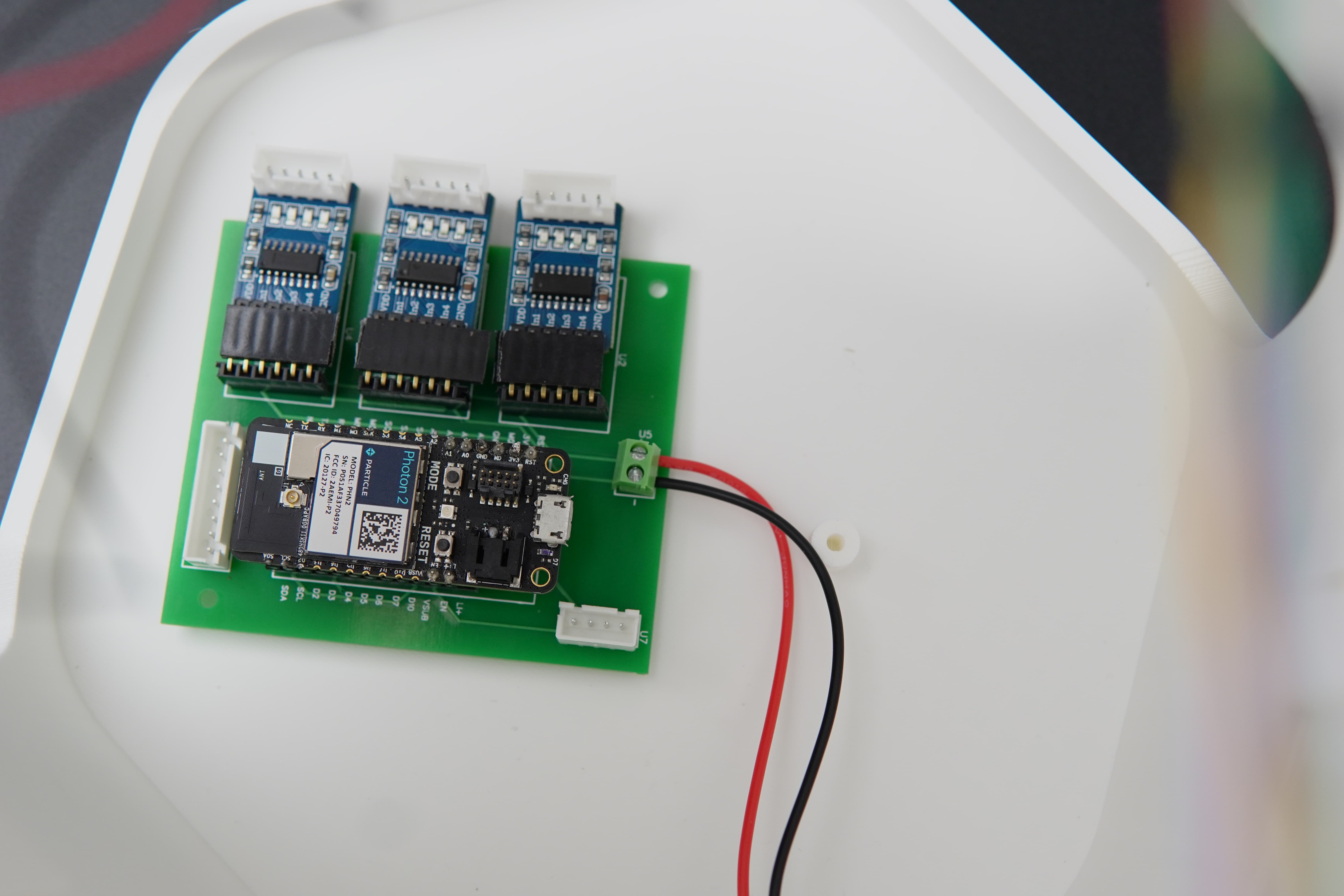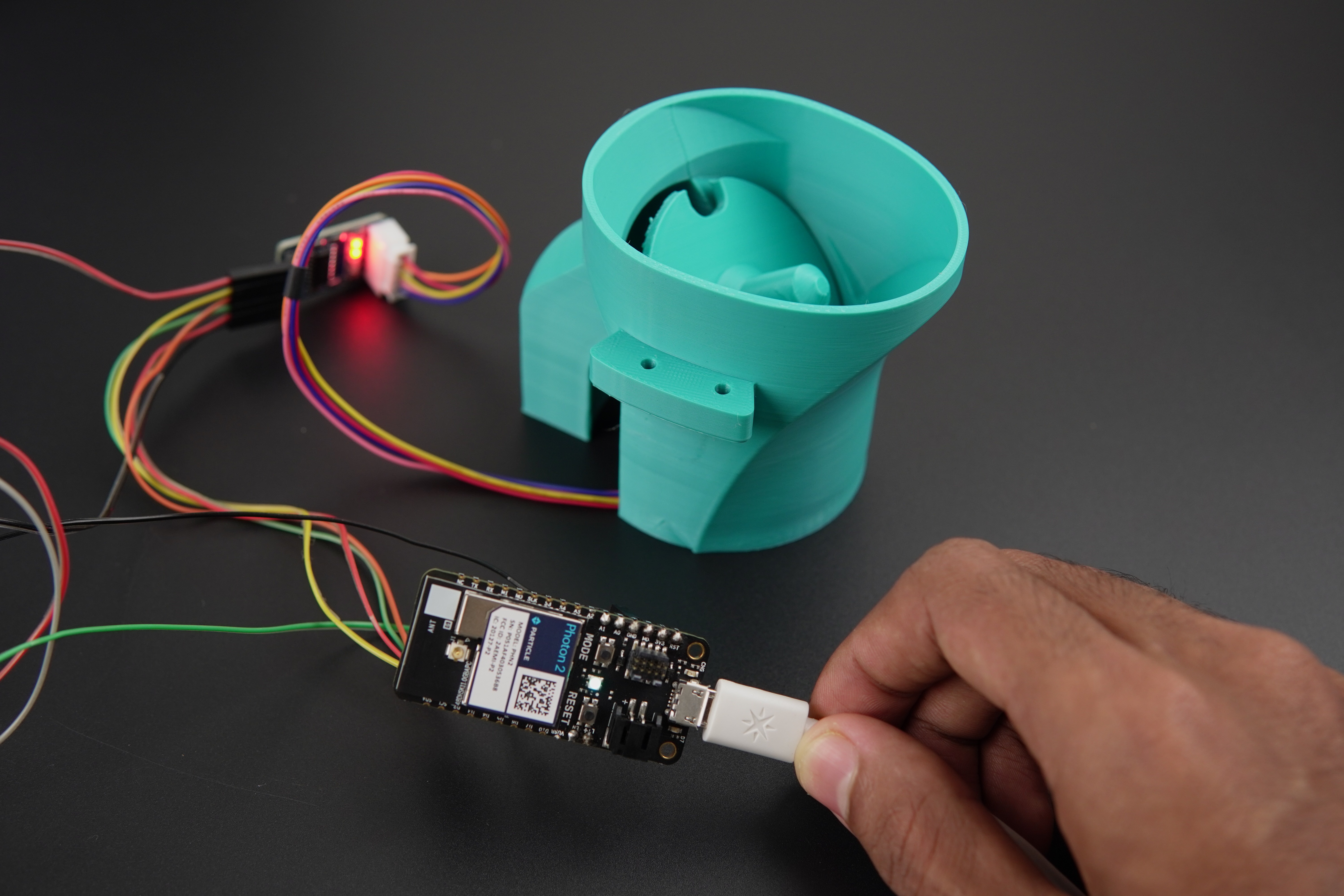 The Particle Photon 2 offers various powering options, including the micro-USB port, VUSB pin, and LiPo battery. For this project, we opted for the VUSB method, providing a stable 5V input directly to the board.
