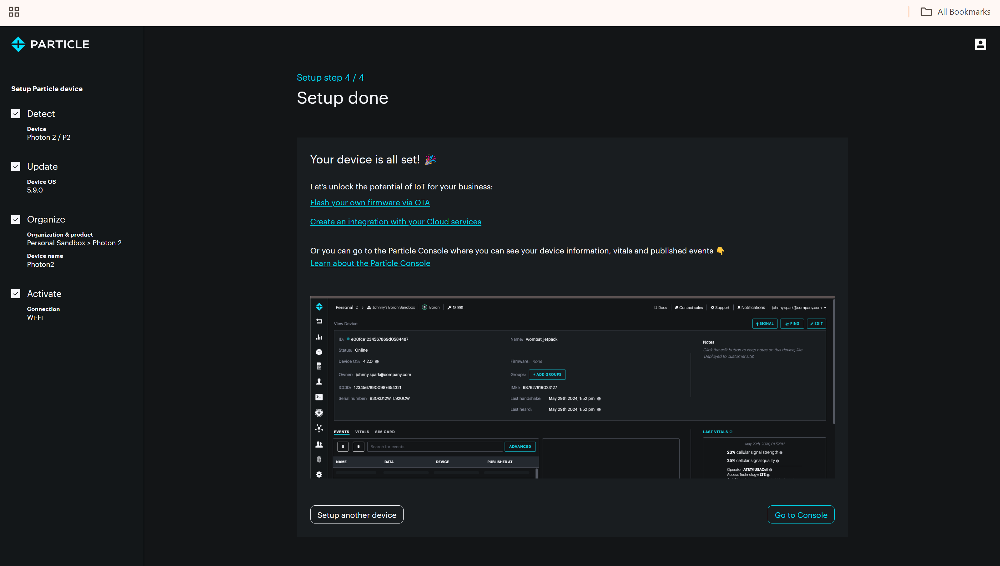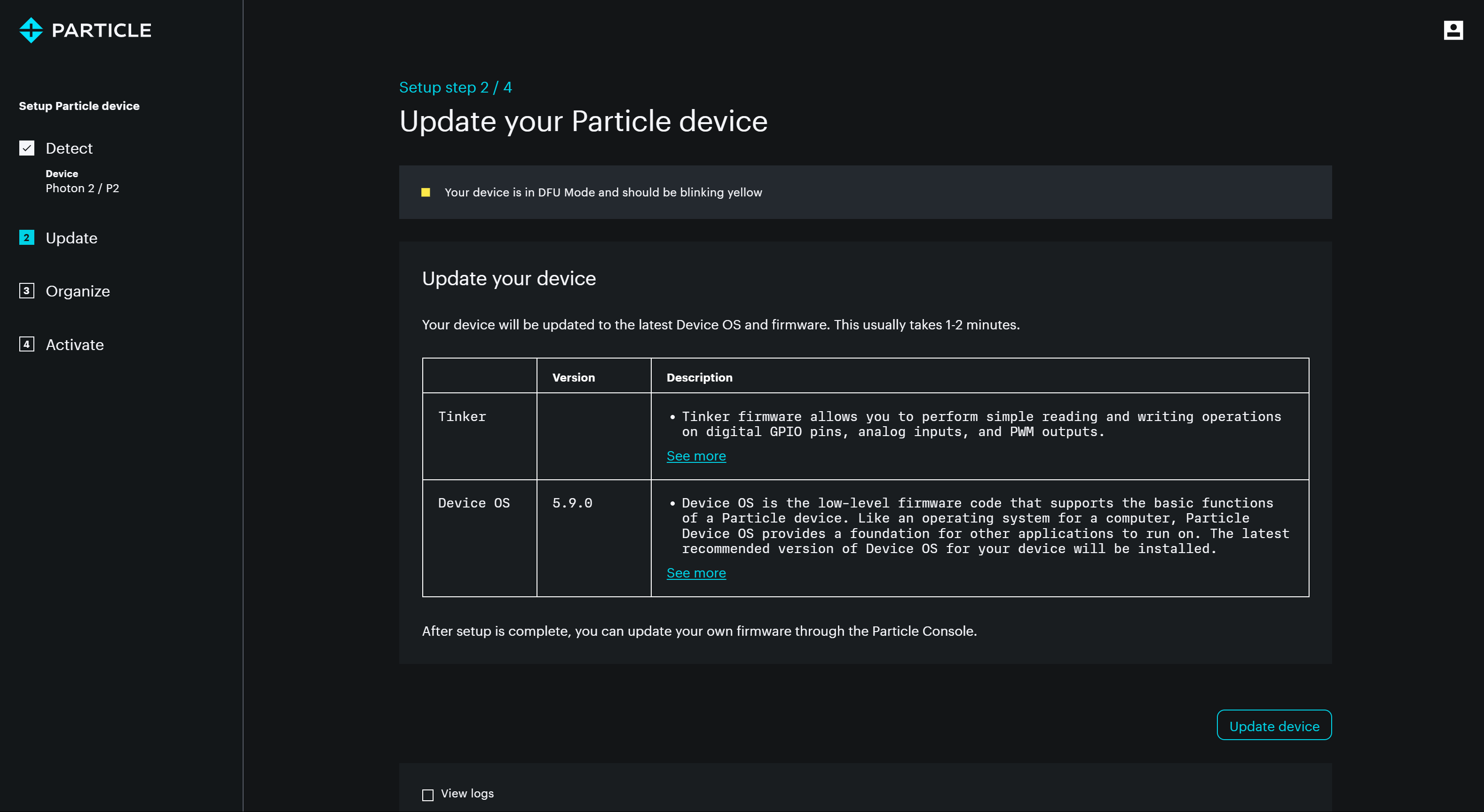 - Once in DFU mode, the setup wizard will flash the necessary firmware to the Photon, preparing it for operation.