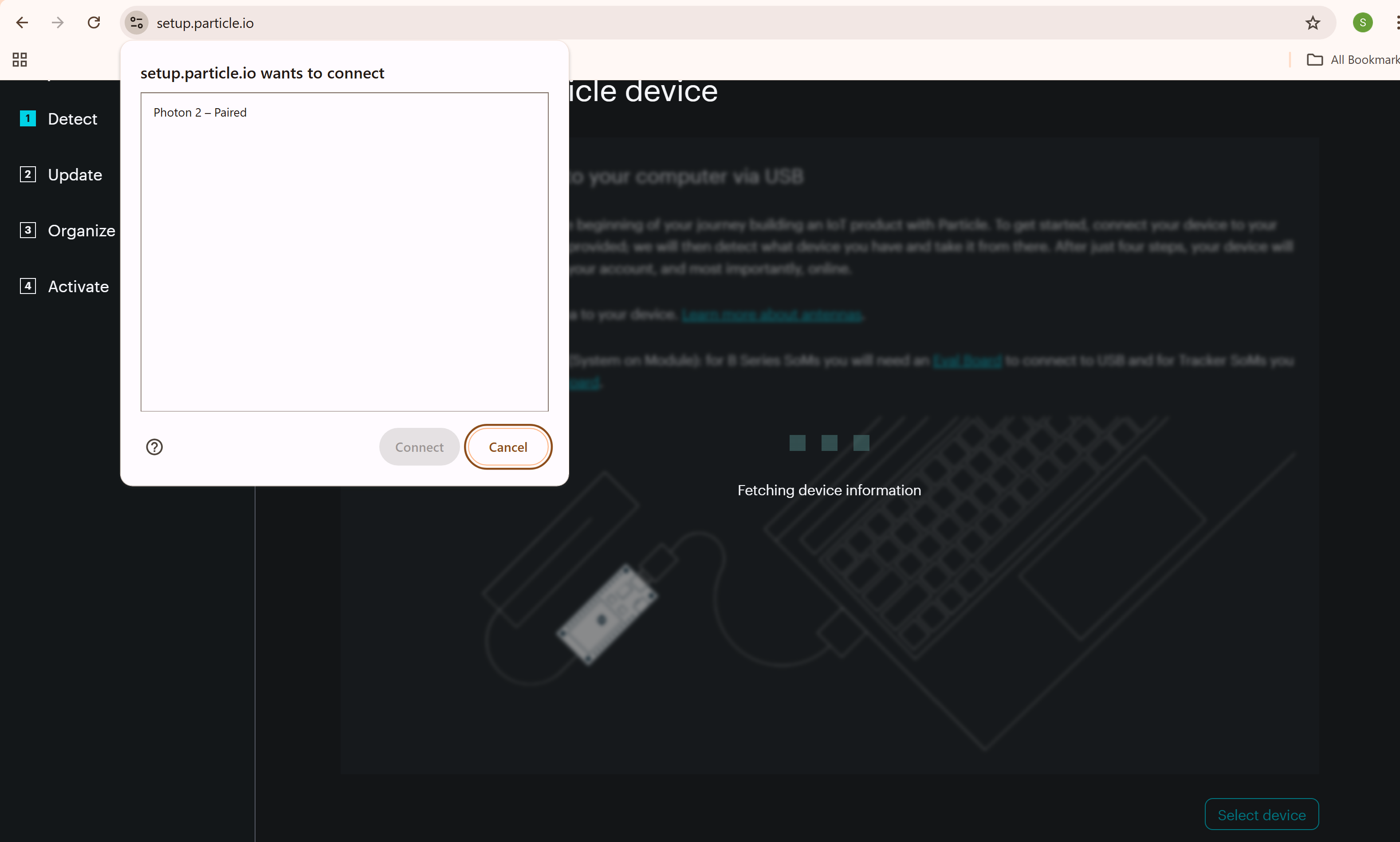 - Ensure the Photon is connected and powered on before proceeding.
