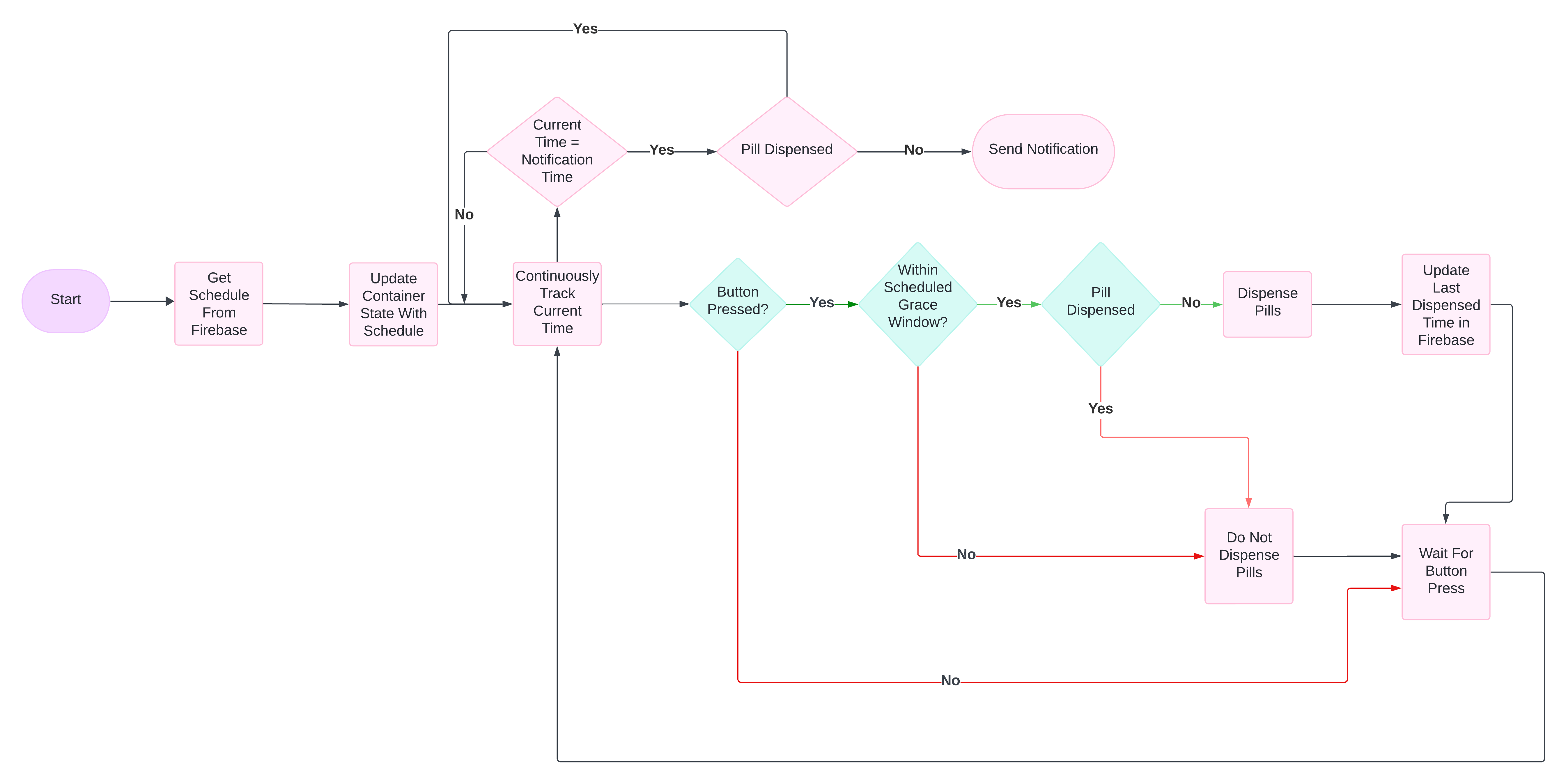 The pill dispenser system operates based on user interaction and scheduled timing. It starts by parsing a JSON input from firebase containing the pill schedule, which updates the state of each container with details like pill names, quantities, and scheduled times.The system continuously tracks the current time and checks if a user presses the button. When the button is pressed, the system verifies whether the current time falls within the grace window of a scheduled dispensing time. If the current time is within this window and the pills have not already been dispensed, the system sends a command to the motor driver to activate the appropriate stepper motor, releasing the pills. It then updates the timestamp to reflect the last dispensing action. If the current time is outside the grace window, the system refrains from dispensing.