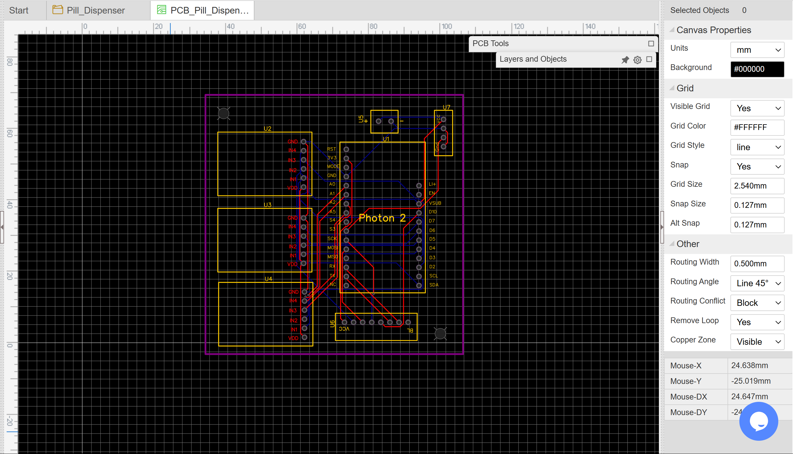 For the PCB design of the Smart Pill Dispenser, we used EasyEDA software. The design consists of a two-layer PCB, which provides a compact and efficient layout. EasyEDA's intuitive interface allowed us to quickly design and test the circuit, ensuring all components were placed effectively while maintaining optimal signal routing and power distribution.
