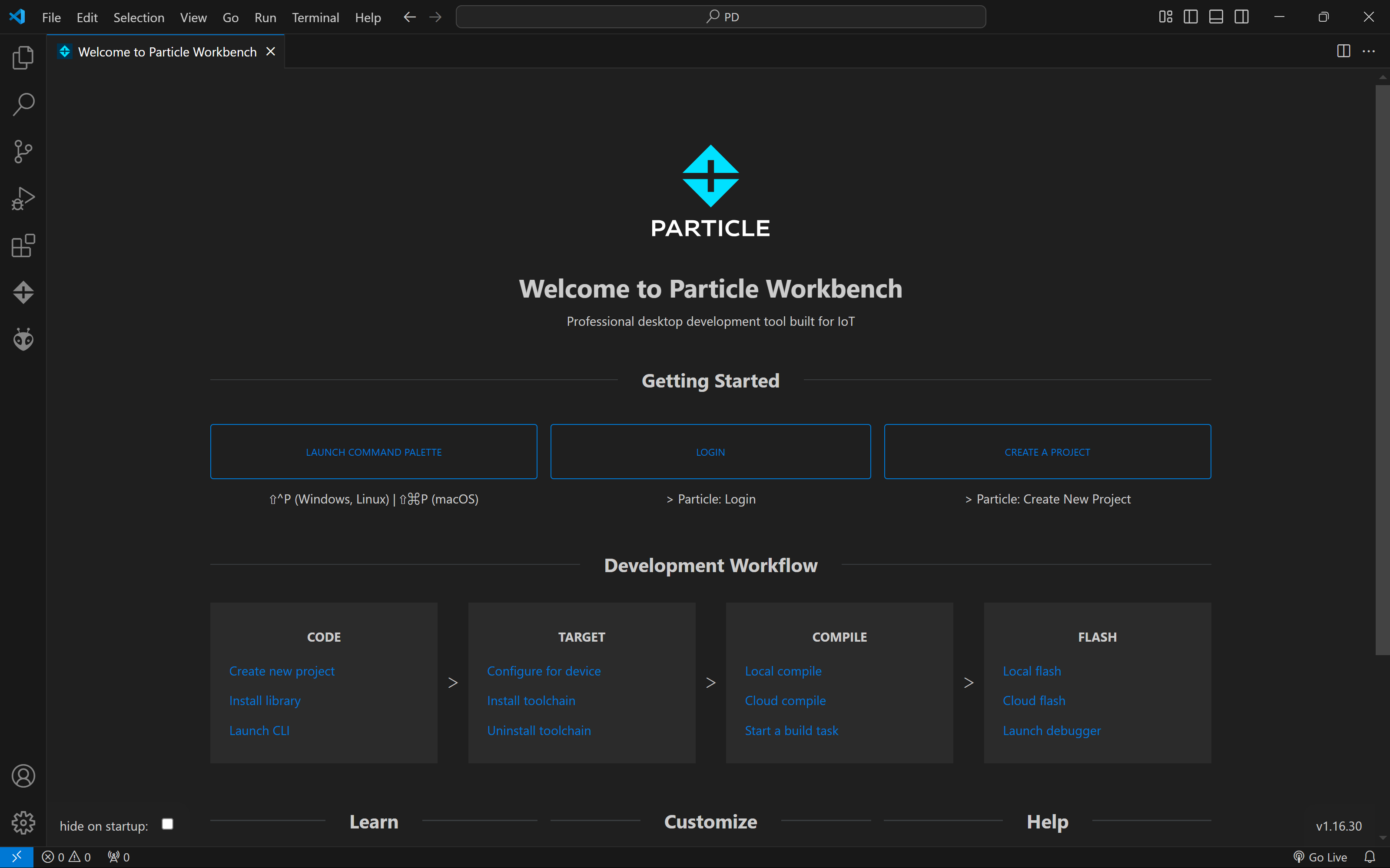The Particle board can be programmed using either the Particle Web IDE or the Particle Workbench. For this project, we chose the Particle Workbench for its flexibility and advanced features. Setting it up is simple—all you need is Visual Studio Code. You can follow the step-by-step guide provided in the Particle Workbench Quickstart.