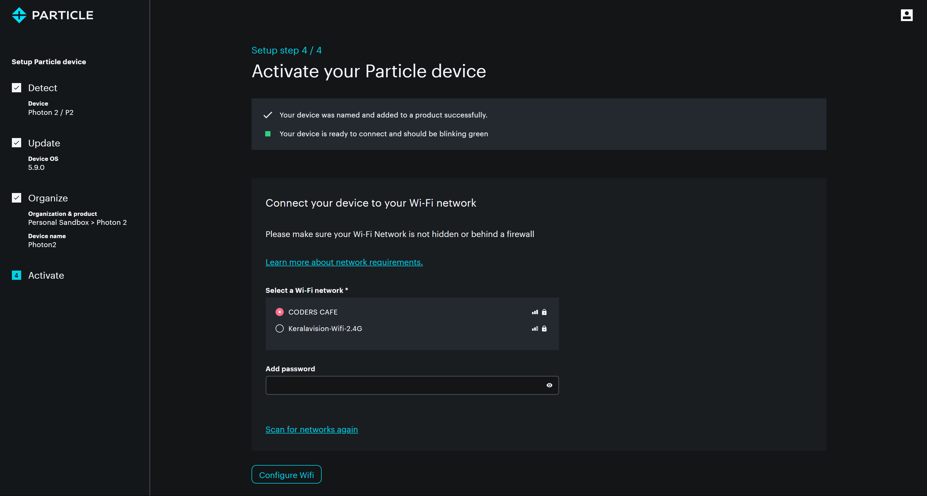 - The next step is to configure the Wi-Fi settings by entering your network credentials, so the Photon can connect to the internet.