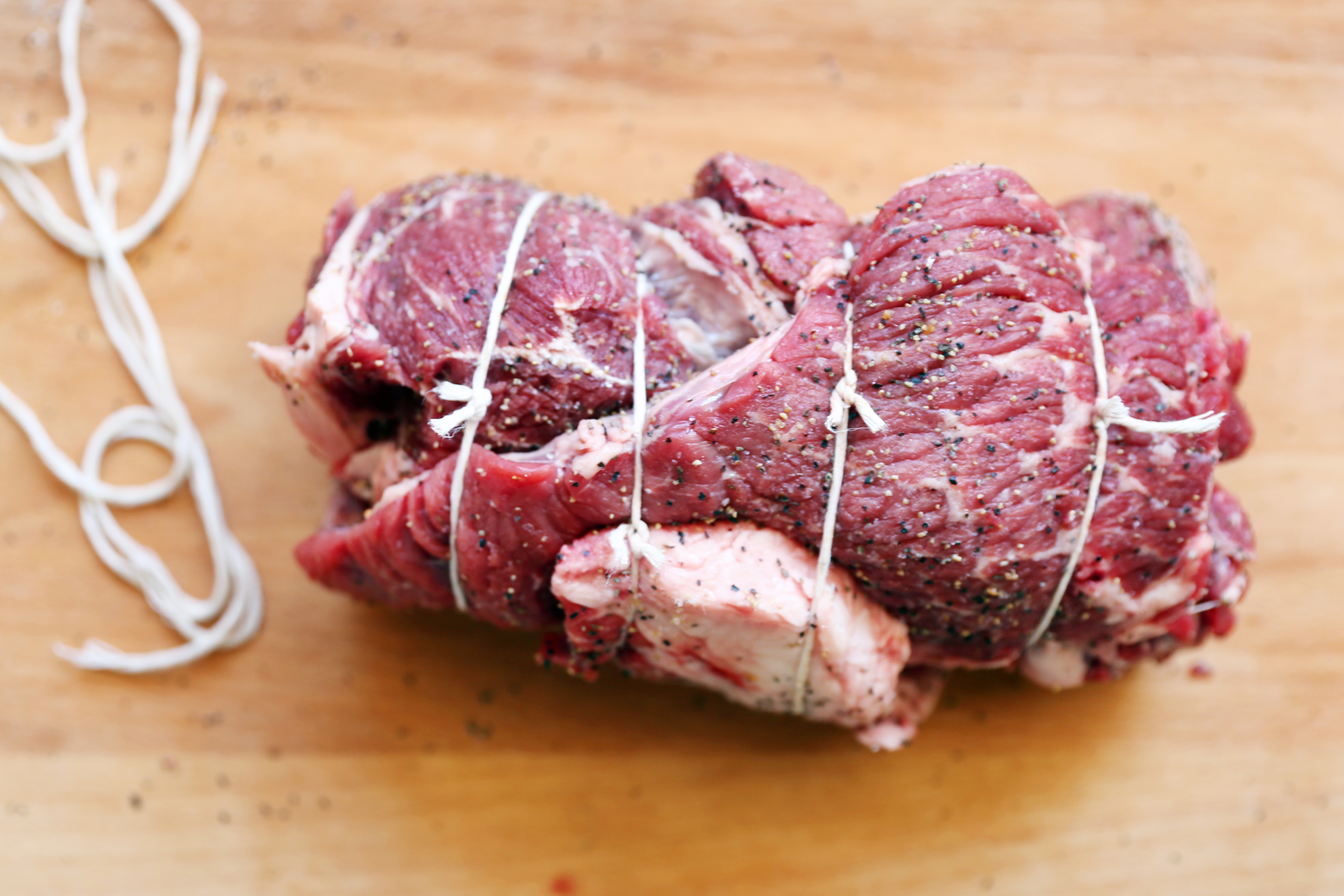 Start with 3-6 lbs. (1-3 kg) of beef chuck. The butcher may have this in rolls or as large flat cuts - either is fine. Generously sprinkle the entire surface with Kosher salt and freshly cracked pepper, then roll into a tight bundle and secure with butcher's twine.