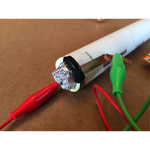 Clip one alligator clip to the copper tape on the side of the PVC tube. Clip the other end of this alligator clip to the Earth on the Makey Makey. Clip another alligator clip to the aluminum foil in the PVC tube. Clip the other end of this alligator clip to the Space key on the Makey Makey.