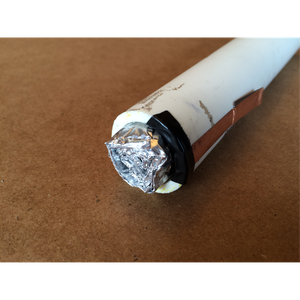 Tear a piece of copper tape approximately four inches long. Remove the backing. Adhere it to the pad of copper tape inside the PVC tube. Continue affixing the copper tape to the PVC tube over the lip and down the exterior of the tube a couple of inches. Finish off the copper tape by doubling it over on itself to leave a flap of copper tape.