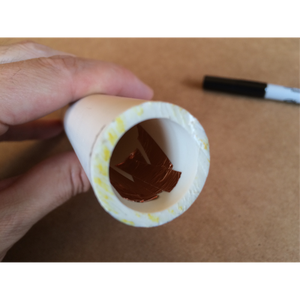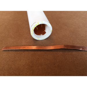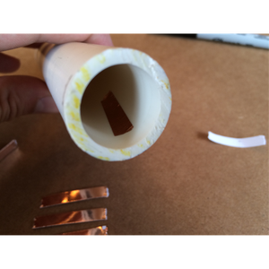 Remove the backing from the conductive copper tape. Using needle nose pliers and a closed pen or your fingers, carefully adhere the tape to the inside of the PVC tube parallel to the length of the tube. Continue placing pieces of copper tape next to the other strips, trying to make each strip overlap slightly the strip next to it.