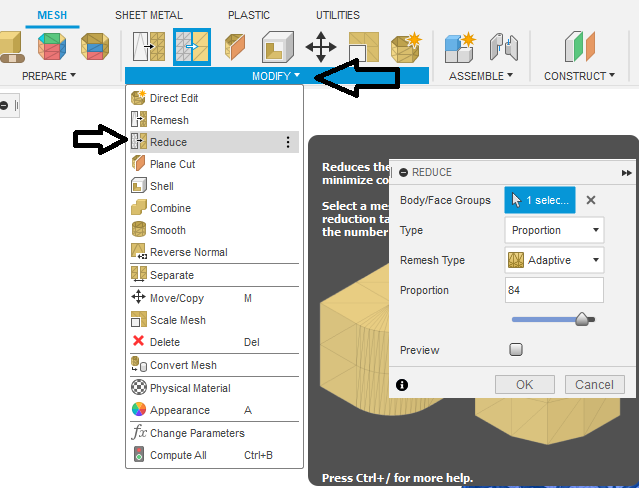 What do we do if the file is to large? We can Reduce the number of triangle by using Fusion360. Fusion360 can look for a few triangles that are mostly flat and group them and reduce the number to one manageable by TinkerCad. There is some loss in the model when we reduce the number so we want to be careful about how we do it.