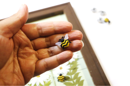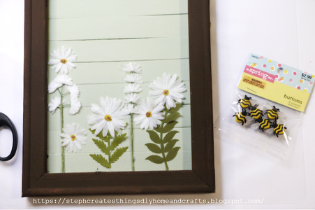 The last step is optional. If you have any bumblebee buttons, or any other details you would like to add to your frame display, do so now. I decided to add on some bumblebee buttons I picked up from my local Hobby Lobby store. Just add a little hot glue on the back side of each button and place them around your flowers.