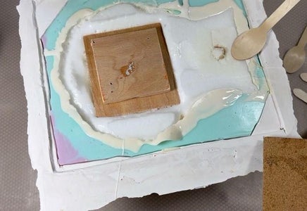 You will pour the foam into the mold, cover the mold with the board and wait for the foam to rise and envelop that small piece of wood. Then, after all is set and done, you will simply unscrew the board from the wood and unmold.
