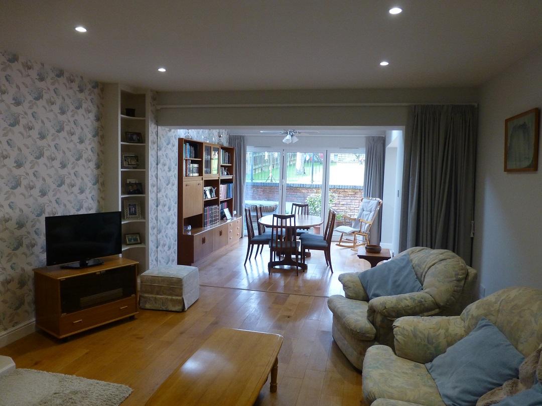 The lounge was a struggle to warm, needing the gas fire on a lot of the time to top up the heating. The lounge is open plan as it has no windows. It is in the middle of one side of house with hall to front and dining room to back. Double doors to the hall but big heat losses to the dining room through a 2.9m (9’ 6”) wide gap. We considered and discarded options of sliding doors and folding doors because of reduced light and inconvenience.