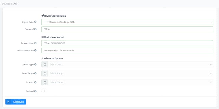 - Device Type - Choice between IoTMP / HTTP / MQTT / NB-IoT. We chose HTTP to continue this article