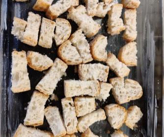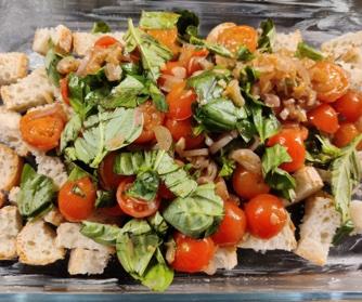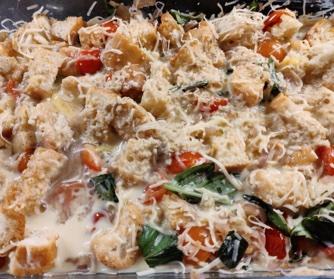 This bread pudding stars caramelized onions, fresh tomatoes and cheese.