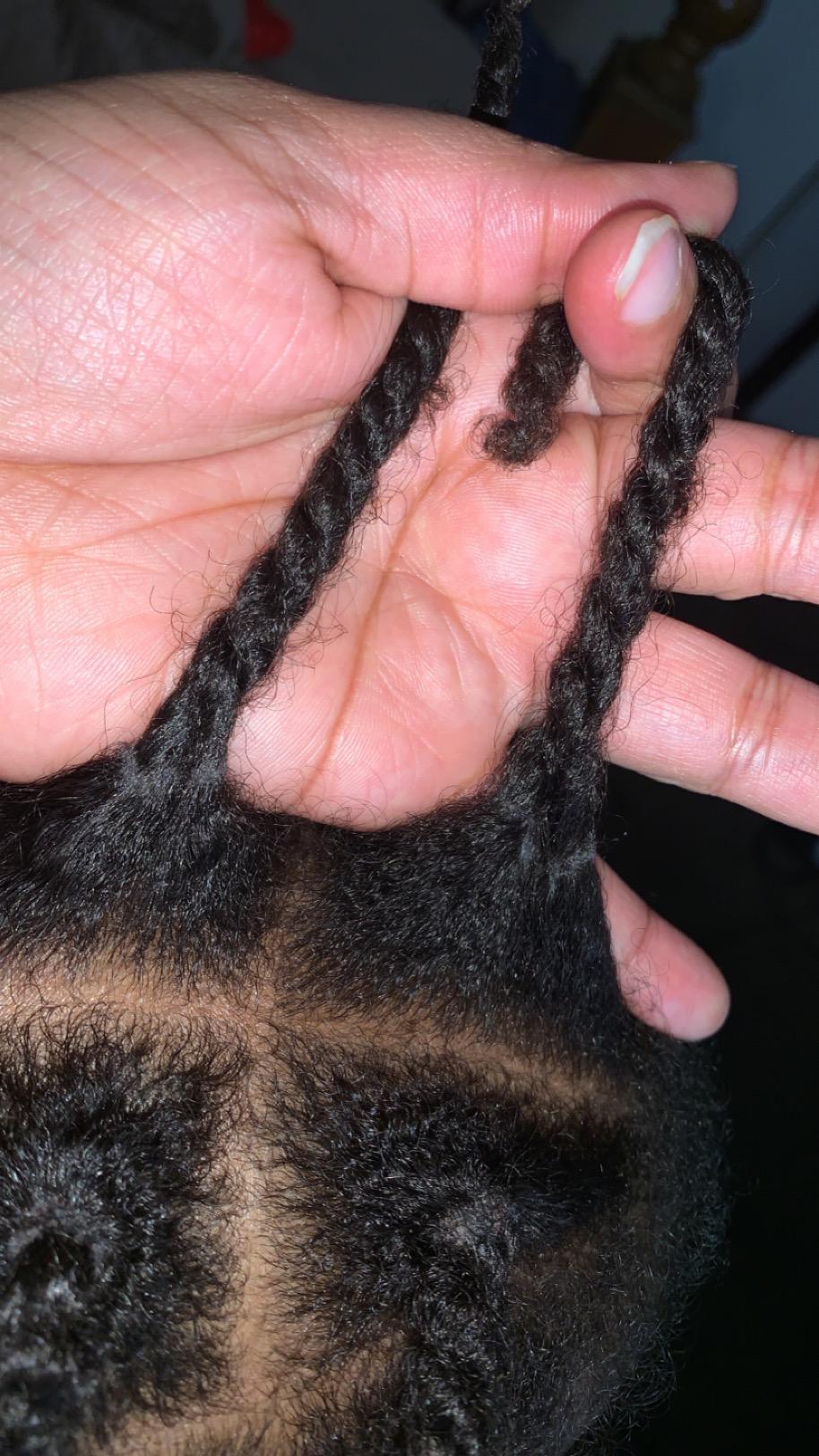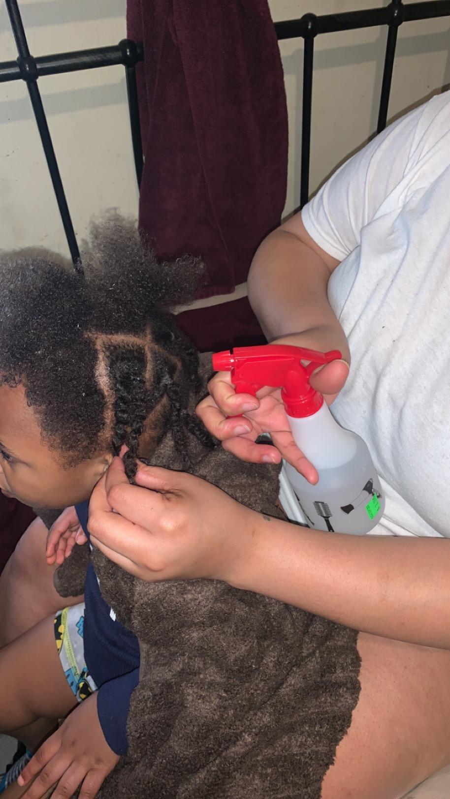 First I start by taking previous plats down that have been up for about a week or two. Carefully remove the rubber bands from each individual plat making sure not to damage his hair. Take the water bottle and spray on the hair from root to end. Carefully detangling and removing any accumulated lint that was left on his hair with a wide toothed comb. This process is tedious because if you don't detangle you could risk having tangled hair while washing and that's not good.