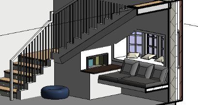I added that and just checked for minor details that I missed. The walls were often going into the stairs and they would peak out of the steps themselves as well as the pillows overlapping or going into something else. I then used Escape to get a rendering for what the space would look like in a more realistic light.