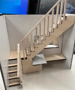 I continued to work on the steps while that printed. Another problem I had was that the pieces that I had leftover were too small or too big for the spaces I had left. At the top of the steps there was a large space that would be connected to the second floor but because I didn't have a second floor for this model I had to readjust and cut out a piece that would over that. In addition, the seating area with the desk was so short and wouldn't reach the second wall that I had already printed.