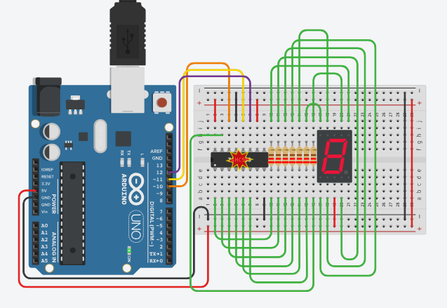 Tinkercad circuits have an excellent feature. It shows you if more than the rated current flows through the circuit elements. In the following circuit, I connected a seven segment display directly to a shift register without any resistor. It is not safe for the register even for the seven segment display and both can be burned by this connection. Tinkercad shows the fact by the red stars.
