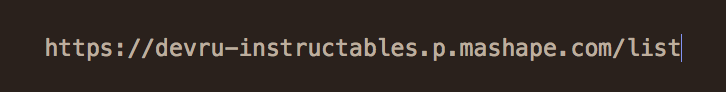Here's our Get List URL from the previous page - https://devru-instructables.p.mashape.com/list?limit=20&offset=0&sort=recent&type=id. Hopefully, upon receiving a request to this endpoing the server will respond with a list of Instructables, like in the example Mashape provides (screen shot above). Click it and see what happens!