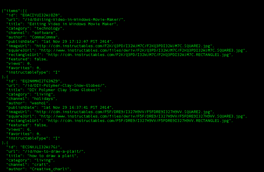 - Get List - sends a bunch of Instructables in the form of metadata, references to the cover image, and a link to the article