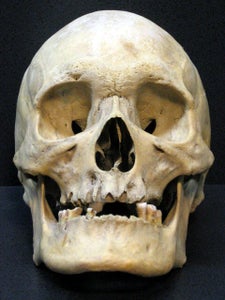 First you will want to do some searching. You will need 1 photo of a person (animals work also), 1 photo of a skull or even a prosthetic mask and a texture to lay over all the images. Depending on the angle of your person's photo it might take awhile to find a skull that matches it.