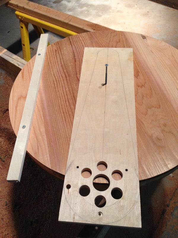 Here's my circle cutting jig. First, I found the center of my hole and drilled in a screw. Then set the distance on the jig and mounted my router with a straight cutting bit. I circled in multiple passes gradually lowering the bit. It worked well. I screwed the small sticker on the left so the center piece wouldn't fall down before I completed the cut.