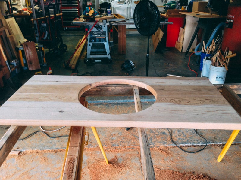 To glue up the top, I used a biscuit jointer to help with alignment. I knew I was going to cut out a giant hole in the middle of the top, so I went ahead and drew a circle so I didn't put a biscuit in the middle of the cut.