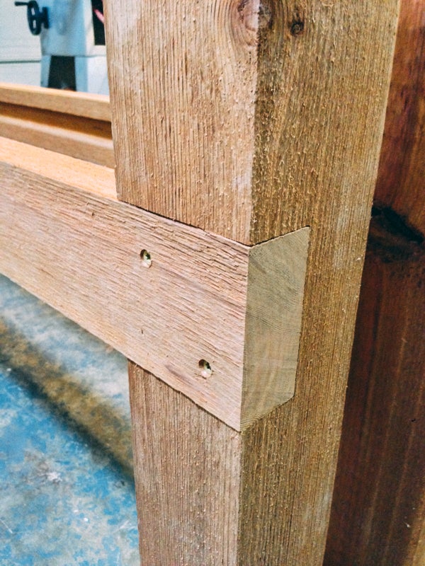 We'll start with the main upright legs. I dadoed out sections for the lateral pieces to fit into. I did this using my radial arm saw and a dado stack, but you can even use a handsaw and a chisel. Once everything was cut, I applied glue and popped in the lateral pieces. I drilled pilot holes with a countersink and drilled in a couple rust resistant screws to hold in the pieces to the dados. You can really see that the upright pieces are doing most of the work by holding up the future weight.